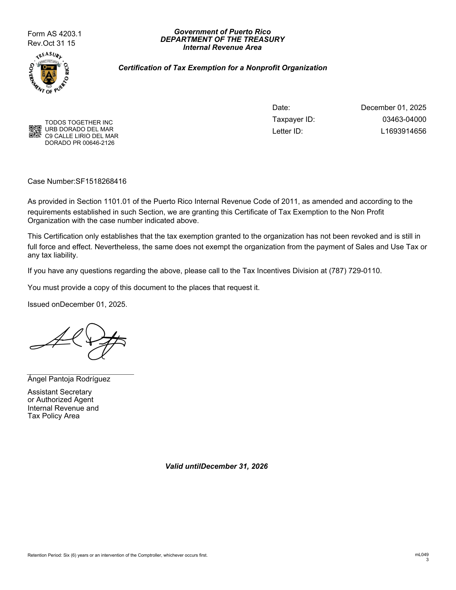 All gifts to Todos Together Inc (EIN 66-0983815) PR tax ID 03463-04000, a 501(c)(3) PR 1101.01 charitable organization, are tax-deductible to the full extent of the law.